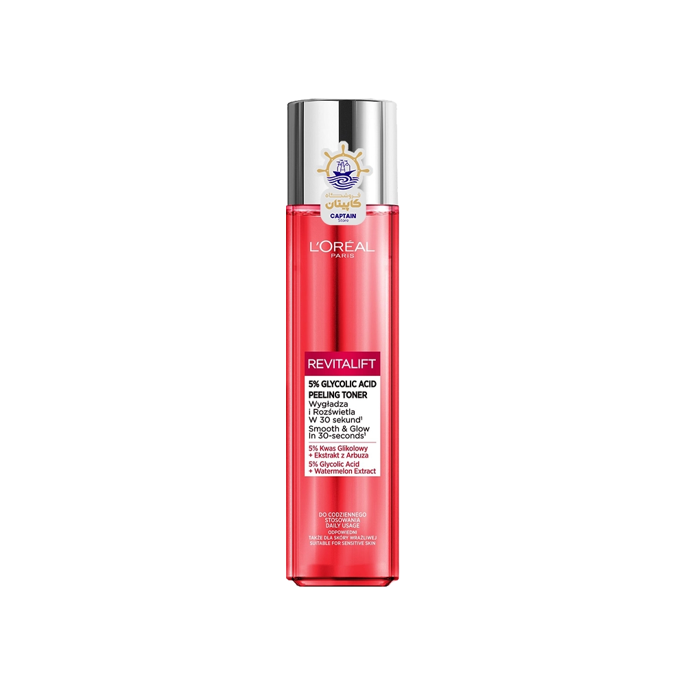 L'oreal Revitalift 5% Glycolic Acid Peeling Toner 180mlتونر لایه بردار روشن کننده و ضد لک لورآل مدل ریوایتالیفت حاوی ۵٪ گلیکولیک اسید ۱۸۰ میلی لیتر محصولی تخصصی و قوی برای بهبود بافت پوست و روشن شدن و کاهش لکهای تیره است.