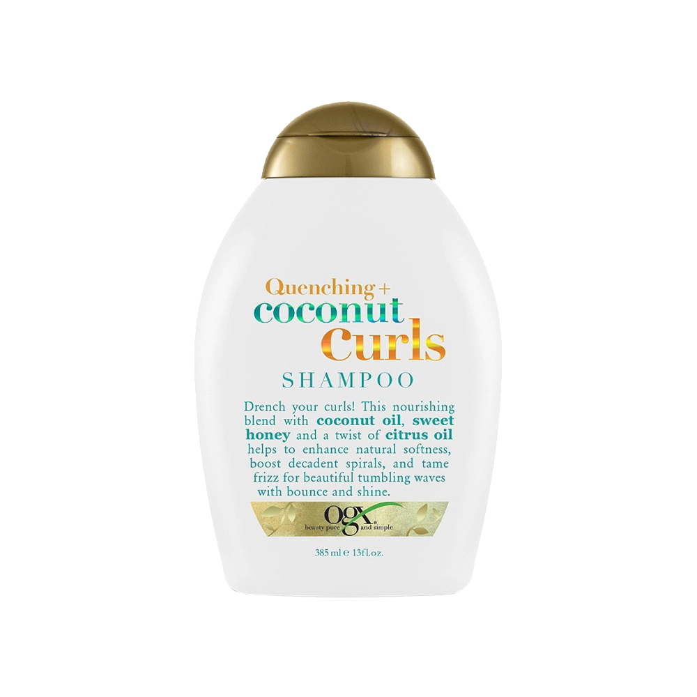 OGX Quenching+ Coconut Curls 385mlشامپوی مو اوجی ایکس مرطوب کننده و فر بازکن نارگیل ۳۸۵ میلی لیتر با فرمولاسیونی مغذی و نرمکننده، موها را از آلودگی و چربی پاک میکند.